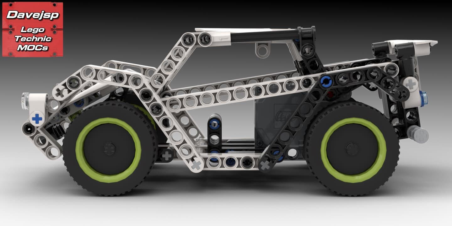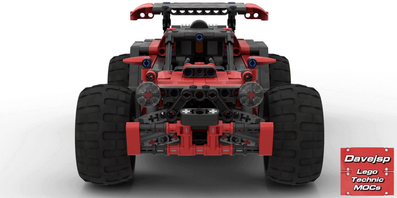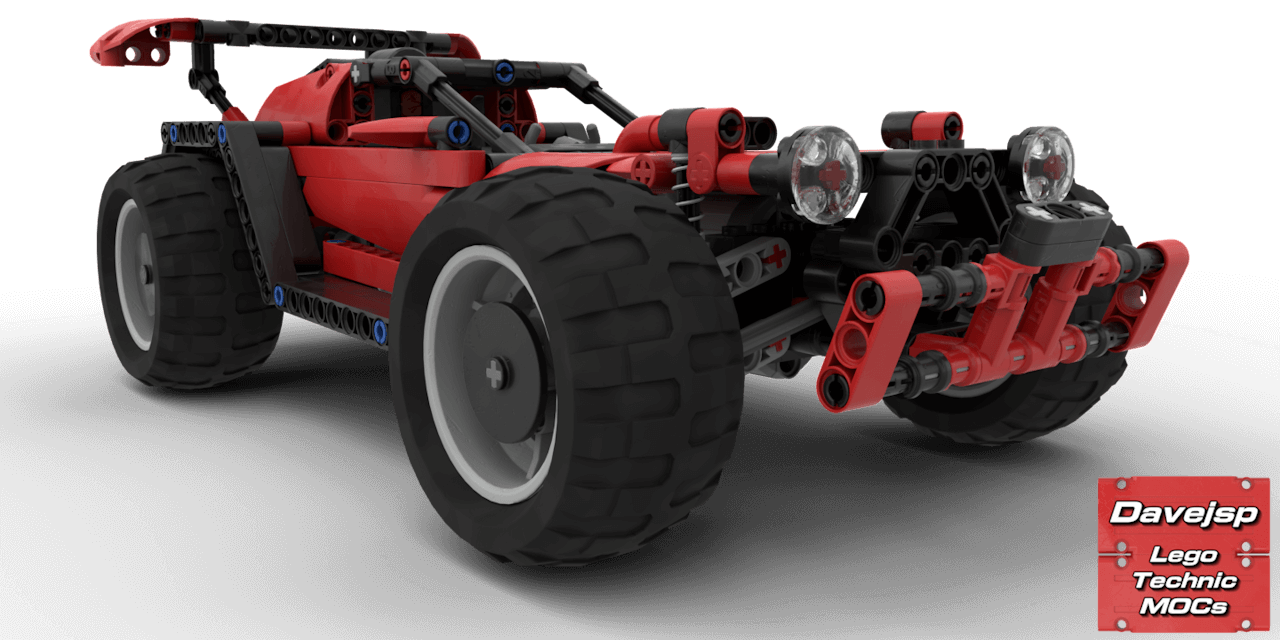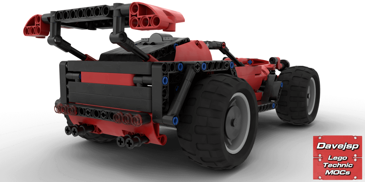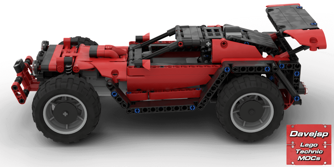 This is a lightweight LEGO® Technic off-road racer built with Power Functions. It features rear-wheel drive via a solid axle with a default 1:1.67 gear ratio powered by a single L-motor, front-wheel steering controlled by a PF servo motor, and independent double-wishbone front suspension for smooth handling over rough terrain.Despite its compact size, it offers reasonable ground clearance for off-roading, and the battery pack is easily swappable. The design style was inspired by the cars from the popular video game Rocket League, giving it a sporty and dynamic look.A fun, functional, and fast RC build that combines realistic suspension at the front with playful, game-inspired styling.