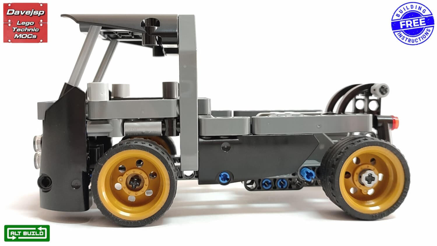 This MOC features remote-controlled rear-wheel drive and steering, along with rear axle suspension that improves handling.The batteries can be swapped with only minimal disassembly, and the building instructions include clear, step-by-step guidance for clean cable management of all electric components. By default, the drivetrain uses a 1.4:1 gear ratio, which I find ideal for indoor driving. However, by using the spare gears included in set 42037, the ratio can easily be changed to 1.67:1, 1:1, or even 1:1.67, all with very minor structural adjustments.The model is built at the same scale as LEGO® Technic figures, and one can even be seated in the driver’s position, an extra detail that makes the build more interesting.