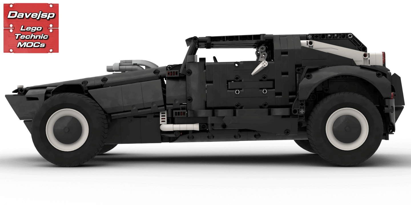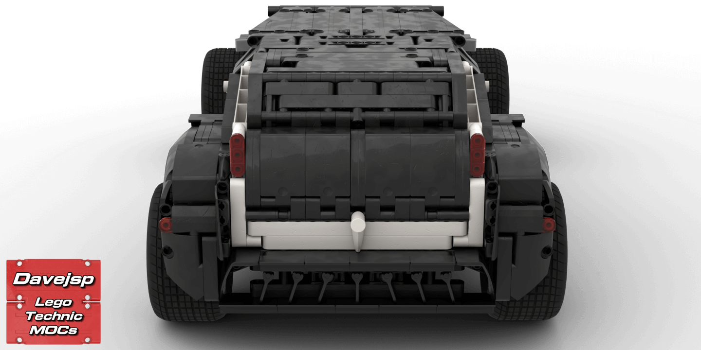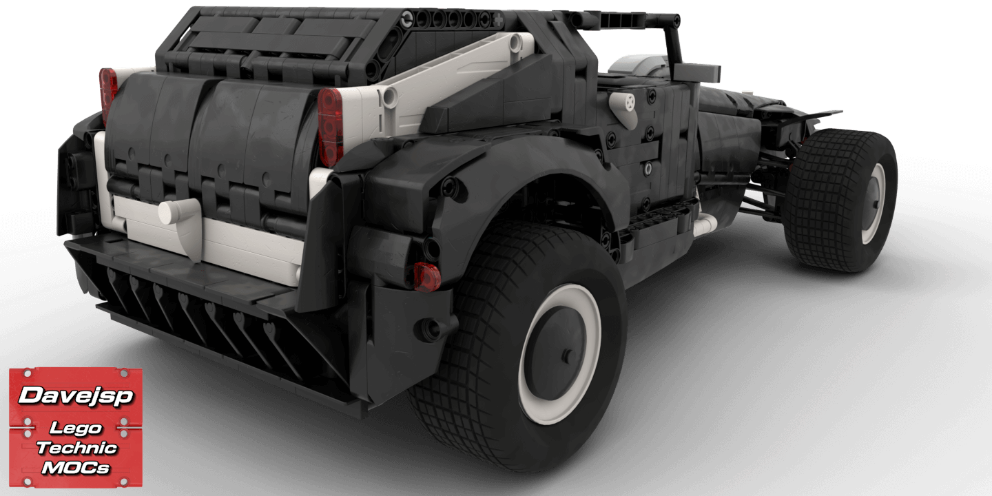 Designing an optimized chassis saved a lot of pieces which I then used to create a more elaborated body, a simple interior, front grid, bull bar and even included a mechanism to slide and unload the spare tire, which is its only manual function.To achieve the objective, several design choices had to be made:
